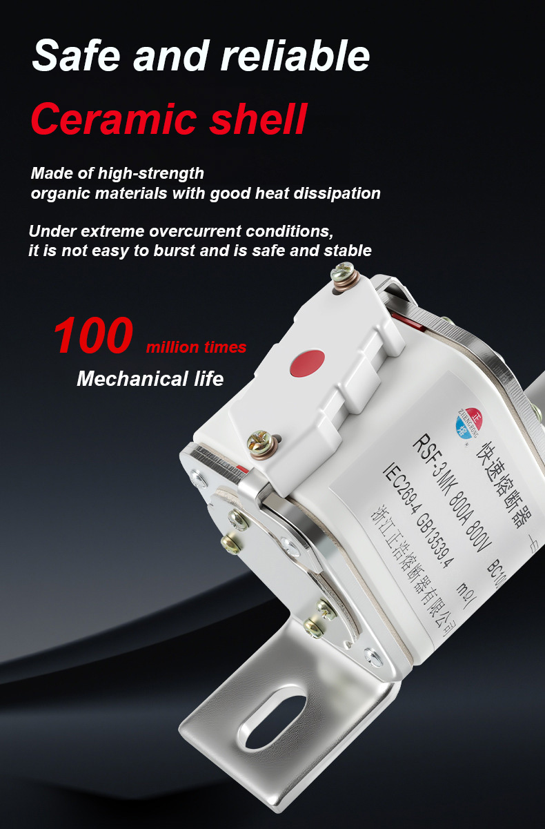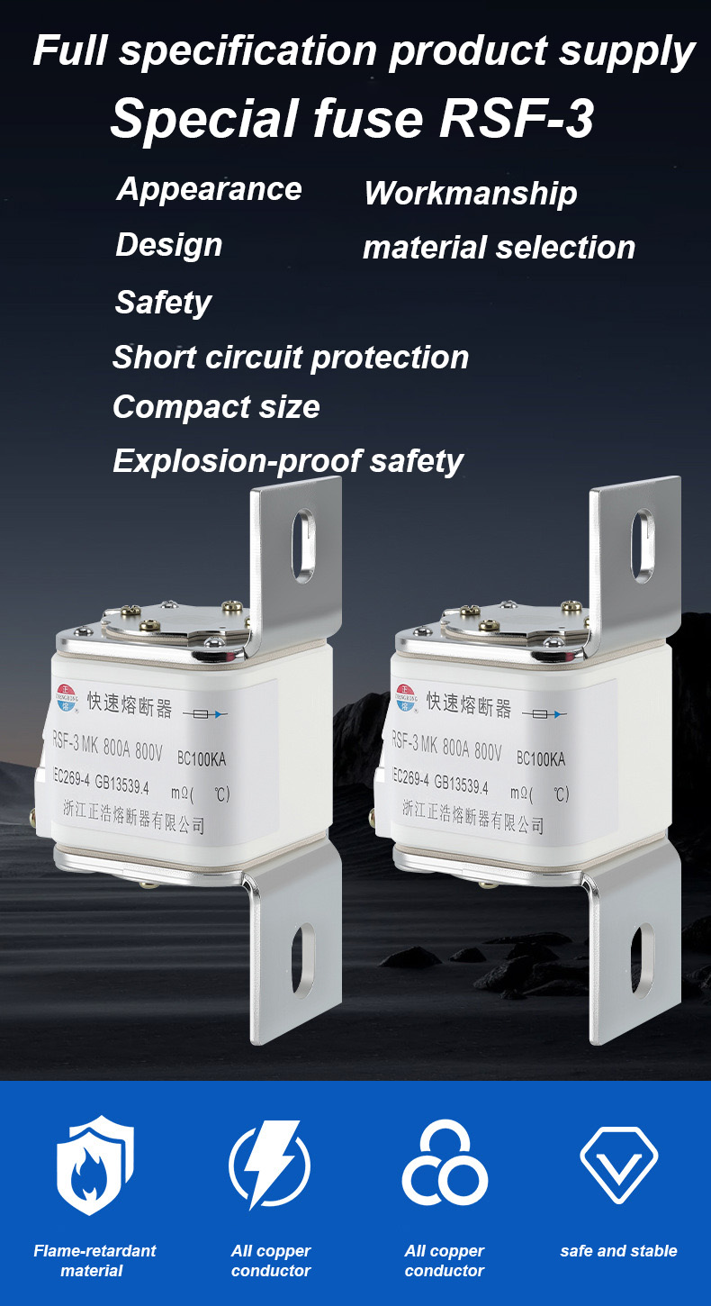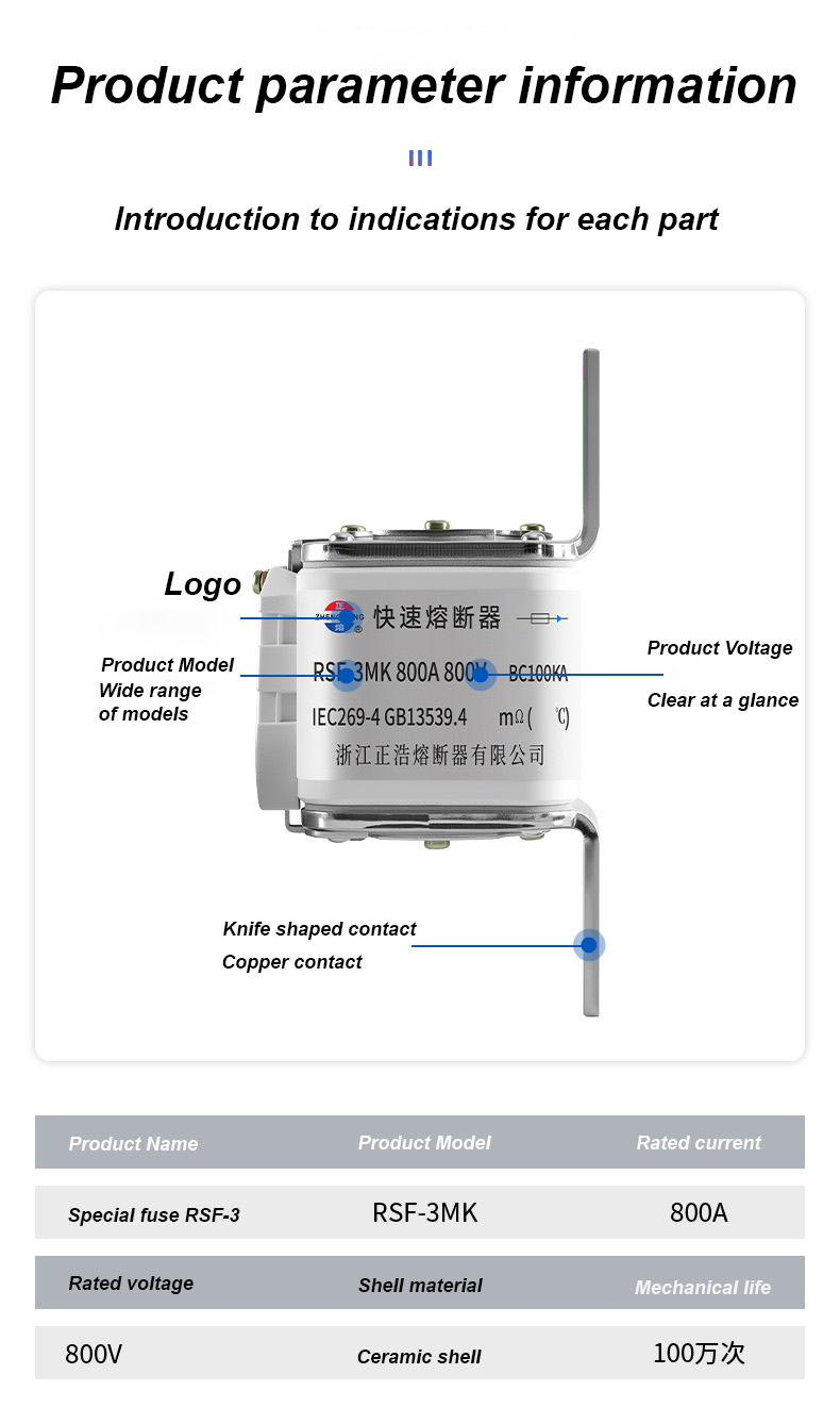 Tá RSF-3MK 800V-800A BC100KA Fuse Links ina scoradán ciorcaid tionsclaíoch ardfheidhmíochta atá oiriúnach do chásanna cosanta leictreach ardchumhachta. Naisc fuse RSF-3MK 800V-800A BC100KA