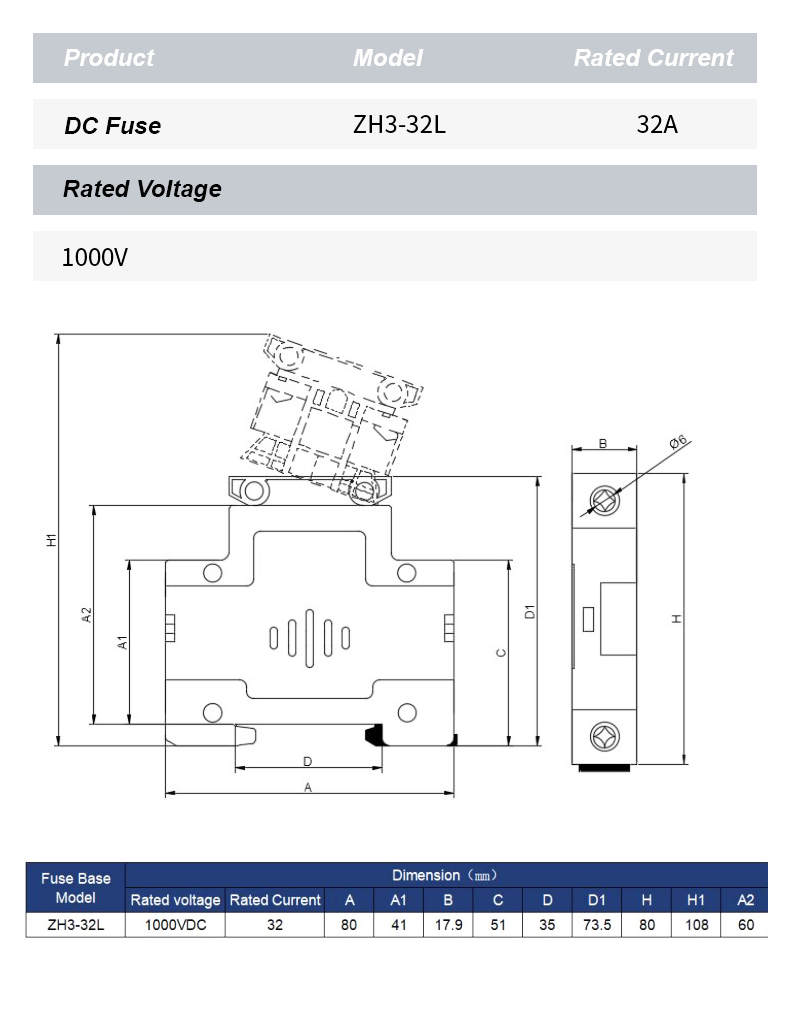 Is comhpháirt ardfheidhmíochta é Sealbhóir Fuse ZH32L DC 1000V atá deartha chun cosaint iontaofa a chinntiú do chiorcaid leictreacha in iarratais fhótavoltach agus DC eile. Le tógáil láidir agus insliú níos fearr, tá an Sealbhóir Fiús ZH32L DC 1000V oiriúnach le haghaidh fiúsanna tithíochta sábháilte suas le 1000V DC, rud a choscann damáiste róshrutha agus gearrchiorcaid go héifeachtach.